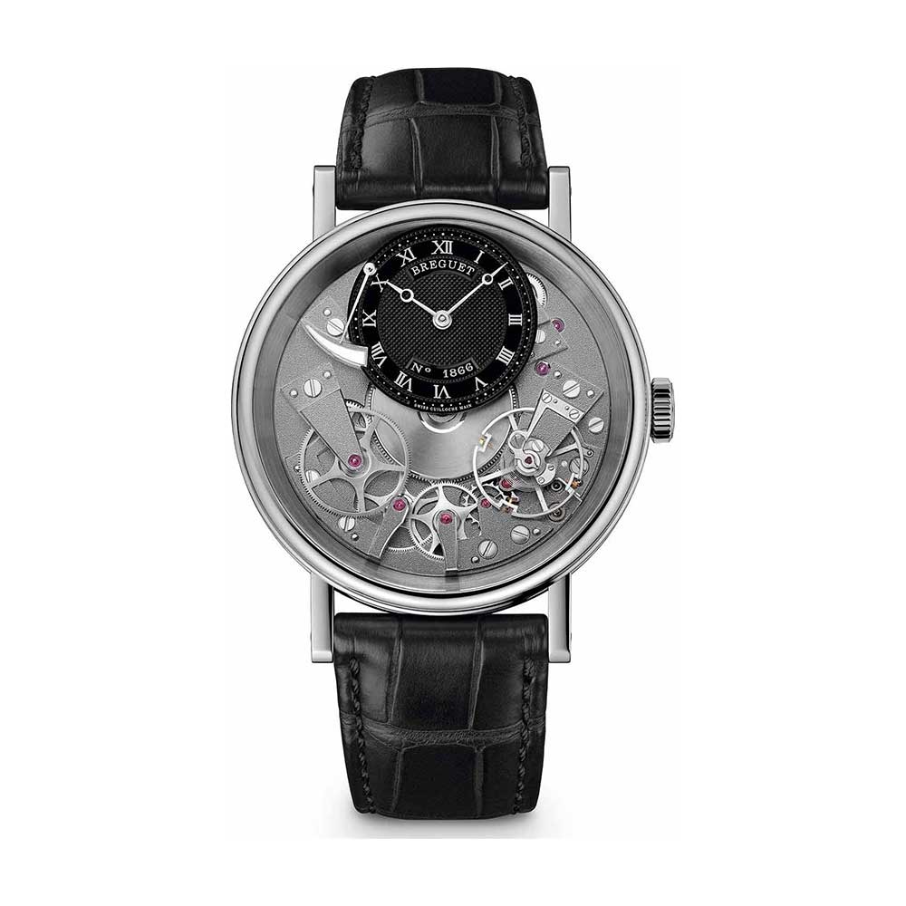 Tradition wristwatch in 18-carat white gold. Hand-wound movement with power reserve indicated on the dial and on the back. Off-centred silvered gold dial, hand-engraved on a rose engine. Sapphire caseback. Water-resistant to 3 bar ( 30 m ).